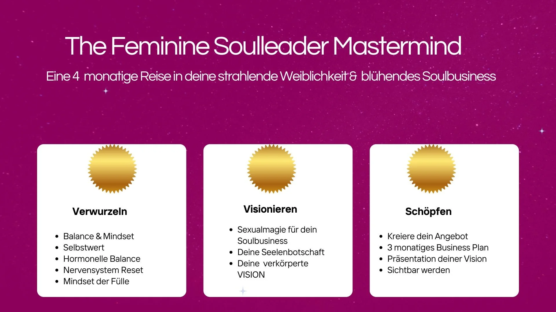 IHR SOULBUSINESS mit einem funktionierenden Business Plan & viel Unterstützung aus der Gruppe professionell zu verwirklichen. Durch deine klare Seelenbotschaft ziehst Du die richtigen Klienten an, die dein Angebot wirklich schätzen.